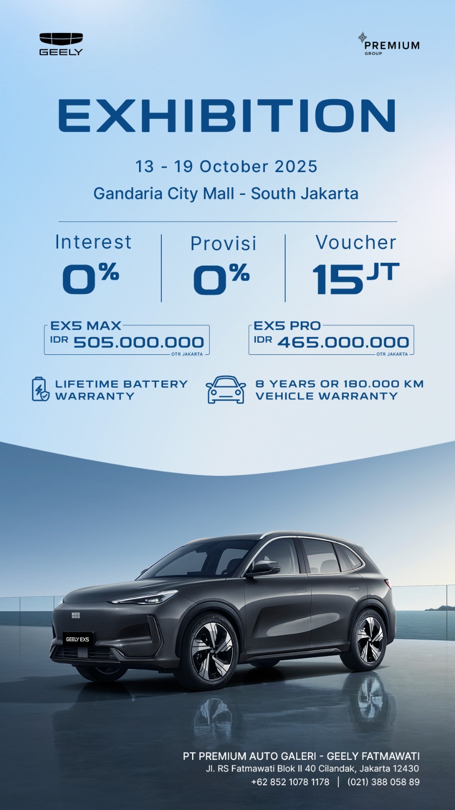 Premium Group adalah dealer resmi Geely yang menghadirkan solusi mobilitas elektrik secara menyeluruh dan tanpa keraguan. Sebagai mitra terpercaya dari Geely, kami berkomitmen untuk memberikan pengalaman kepemilikan mobil listrik (EV) yang nyaman, aman, dan memuaskan. Premium Group menyediakan kendaraan berkualitas tinggi, layanan purna jual profesional, serta suku cadang asli yang terjamin keandalannya. Semua dirancang untuk menjawab kebutuhan dan gaya hidup beragam pelanggan kami.